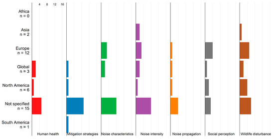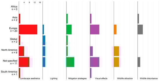 Field studies and literature reviews are the most frequent types of studies. However, less than one-third of the studies are based on measured data, while the majority rely on datasets or databases, modeling and simulation approaches, surveys, and media analyses or summarize and synthesize information from other studies. A large spatial heterogeneity is found related to the study areas. Europe (45%) and North America (21%) together account for two-thirds of all studies (Figure 1). Both continents are characterized by high installed onshore wind energy capacities of 210 GW and 163 GW in 2022 [161]. Only 5% of the studies refer to an Asian study area, although Asia has the highest onshore wind energy capacity (393 GW). In contrast to all other regions, the proportion of studies addressing impacts on birds and bats is very low in Asia. Social acceptance-related studies only refer to Europe and North America. Most studies focus on impacts on birds and bats (50%) or the biotic environment (11%), while information on noise impacts (3%) is scarce.