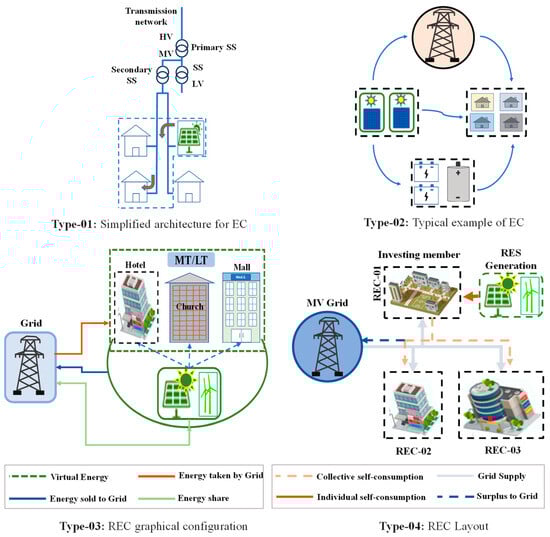 | Type-03 [119] | Only RES power plants, MT/LT Network, no possibility of direct private connection from plant to final users, the shareholders or participants or members must near the facilities of RES plant, energy exchanges | RES Plants, Grid, Load for Hotel, church, and mall | Production; sale; sharing; energy exchange within the EC is virtual; access to all electricity markets, directly or via aggregation; supply of energy; aggregation and other commercial energy services. |