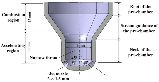 Under the target of “Carbon Peak” and “Carbon Neutral”, hybrid electric vehicles (HEV) are increasingly favored by enterprises and consumers because of their fuel–electric synergistic technology, which offers good fuel efficiency and low emissions while considering the range of vehicles. Compared with stoichiometric combustion, lean combustion can improve the specific heat ratio of the mixture [1,2,3,4], resulting in improved engine thermal efficiency. Still, it faces the challenges of ignition difficulty and low flame propagation. The pre-chamber ignition system is recognized as one of the most reliable methods to achieve lean combustion [5].