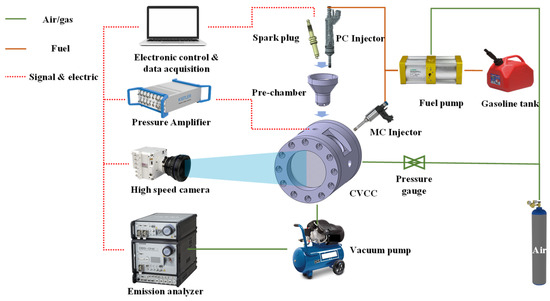 The control system of ignition and injection was developed in-house using NI Compact RIO and LabVIEW. The pressure data acquisition system consists of a pressure sensor (Kistler 6115CF-4CQ07-4-1, Kistler, Shanghai, China), a charge amplifier (Kistler 5064, Kistler, Shanghai, China), and a computer with a data acquisition LabVIEW 2013 program. The spark and flame development are directly captured by a high-speed photography system, which includes a high-speed camera (Phantom VEO 610, Phantom, Shanghai, China) and a computer with camera control software. The camera is synchronously triggered with the spark ignition. The high-pressure injection system includes a gasoline tank, a fuel pump, a low-flow PC injector, and a main chamber (MC) injector. The initial ambient pressure inside the CVCC is controlled through a pressure-reducing valve and pressure gauge.