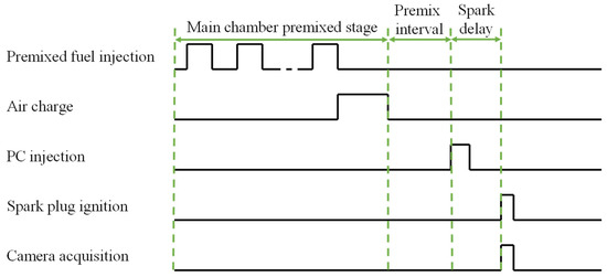Figure 3 shows the gasoline mixture preparation and signal control during the experiment. To ensure that the gasoline fuel is relatively uniformly mixed in the main chamber of CVCC, the CVCC is heated to 373 K before the experiment. Then, a sufficient amount of fuel is injected in the premixing stage by the MC injector according to the condition. Subsequently, the corresponding mass of air is charged and left for more than 180 s as a premix interval. It is ignited after the premix interval with PPC. When the ignition method is APC, there is an injection process with a PC injector after the premix interval. The spark delay in the PC is set at 1 ms.