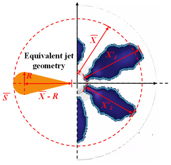 The geometric development of flame jet is similar to the entrainment of spray and fuel-premixed combustion. Its geometric shape can be approximated as a combination of triangle and semicircle [17], as shown in Equation (5).