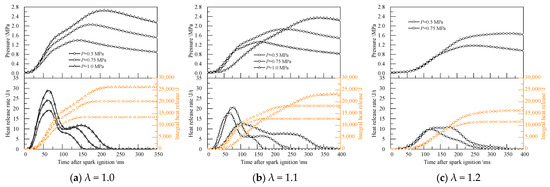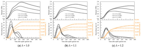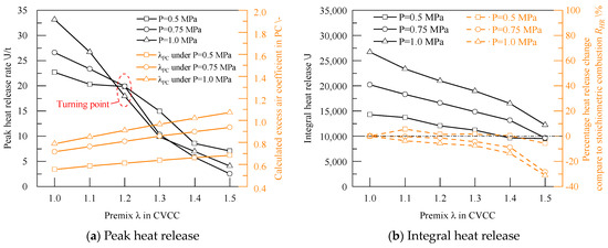 Since the total amount of fuel differs at different λ and ambient pressure conditions, the calculated integral heat release is challenging to evaluate intuitively. The heat release rate of CVCC is calculated using the isentropic index algorithm that ignores the heat exchange of the chamber. As shown in Equation (1), the calculated heat release result is lower than the actual heat release.