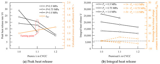 - At the stoichiometric combustion and slightly lean combustion (λ = 1.0 and λ = 1.1) conditions with APC, the peak heat release rate positively correlates with the initial ambient pressure increase. As the premixed λ increases, the peak heat release rate and ambient pressure negatively correlate.