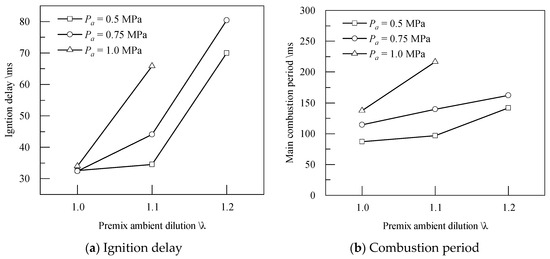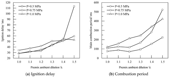 Figure 7 shows the changes in the ignition delay period and main combustion period of PPC at different premixed λ at different initial ambient pressures. The ignition delay at different initial ambient pressures with stoichiometric combustion is consistent, indicating that the ignition delay is not significantly related to the ambient pressure at the stoichiometric ratio. The initial ambient pressure increase in the pre-chamber makes the ignition delay and main combustion period significantly prolonged, which may be due to the flame propagation speed in the PPC reducing with the increase in premixed λ.