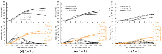 Figure 5 shows the combustion pressure and heat release rate of stoichiometric combustion and lean combustion of PPC at different ambient pressures. Figure 6 shows the combustion characteristics of PPC with different λ at different ambient pressures. The increase in premixed fuel causes the maximum pressure and integral heat release to increase with the increase in initial ambient pressure. It can be found from Figure 5 and Figure 6 that as premixed λ increases at high ambient pressure (1.0 MPa), the combustion performance decreases sharply, and the peak heat release rate decreases rapidly compared with low ambient pressure. The peak heat release rate at 1.0 MPa ambient pressure is reduced to the minimum when λ = 1.1 as the turning point showing. The integral heat release change ratio RHR is only higher than the stoichiometric combustion condition at lean combustion condition with 0.5 MPa ambient pressure. With 0.75 MPa and 1.0 MPa initial ambient pressures, RHR decreases as λ increases. At the same time, lean combustion will reduce the flame propagation speed and slow down the intensity of combustion heat release. The heat release curve gradually becomes flat, and misfire occurs at 1.0 MPa ambient pressure of λ = 1.2.