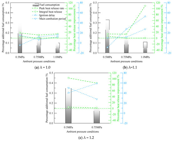 The difference in integral heat release in Figure 9b at different ambient pressure conditions gradually decreases as λ increases, indicating that the combustion heat release efficiency of high ambient pressure decreases faster than that of low ambient pressure. By converting the combustion efficiency with the stoichiometric ratio, the integral heat release percentage change value RHR in Figure 9b can be the same as the PPC. The lean combustion efficiency of low ambient pressure jet ignition is improved in most conditions. The combustion efficiency improves the most when λ = 1.1, reaching 5.6%. When approaching the lean limit, the RHR decreases. Relatively high ambient pressures of 0.75 and 1.0 MPa will cause the lean combustion efficiency to continue to decrease. RHR drops to the minimum value at various ambient pressure conditions when approaching the lean limit λ = 1.5.