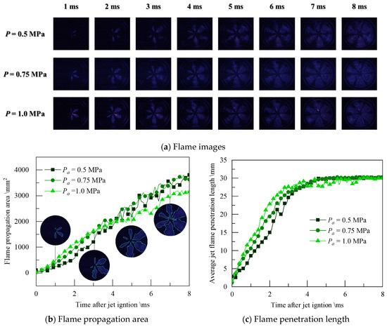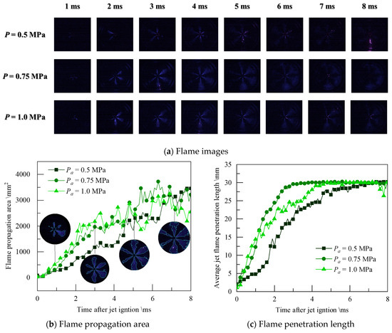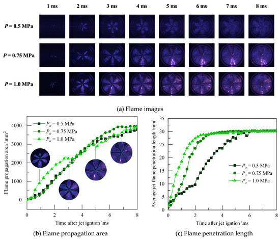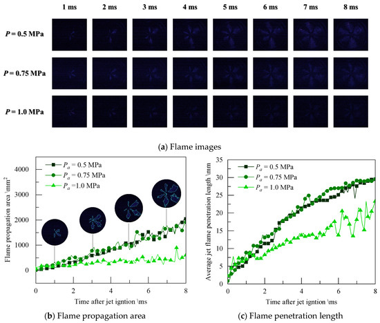 The changes in flame propagation area at three different initial ambient pressure conditions are relatively close. At the condition of 1.0 MPa, the jet flame area increases rapidly in the initial stage, mainly related to the proper mixture state in the PC. The jet mixture concentration closer to the stoichiometric ratio brings a high-intensity jet flame, as shown in Figure 12c. The average penetration length of the jet is longer at the same time as the ambient pressure increases, indicating that the jet flame propagation velocity at high ambient pressure is faster in the initial stage of the jet ignition.