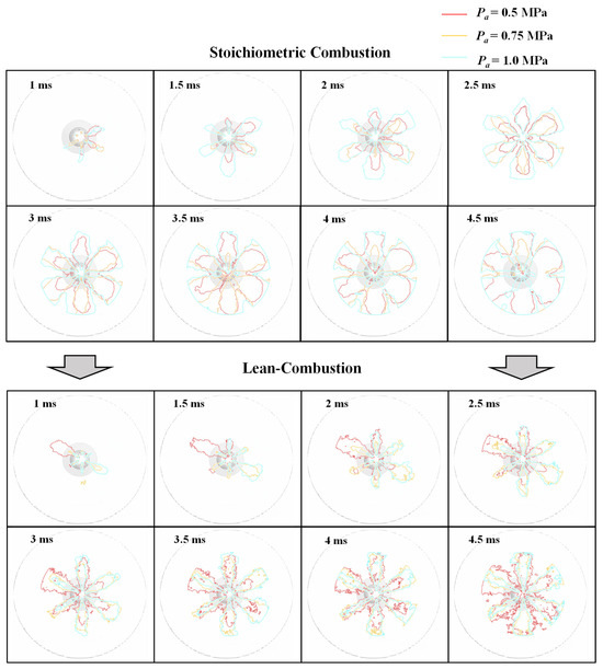 Figure 17 shows the evolution of the flame profile at different ambient pressures at λ = 1.2. At high ambient pressure of 1.0 MPa, combustion heat release performance decreases, jet velocity decreases, and uniformity worsens. Due to the weak entrainment ability of the flame area, the circumferential propagation speed slows down. Although the jet entrainment volume is directly related to the jet velocity, the effect of high ambient pressure dominates. The result of ambient pressure on jet flame propagation is mainly reflected in transforming a wide jet flame into a narrow jet flame, thereby prolonging the in-plane flame propagation time. It can also be seen from the figure that the jet flame is asymmetrical because the spark plug in the pre-chamber is not installed in the central position, so the distance between the electrode gap and the outlet of the pre-chamber is different, thus showing the non-uniformity of the jet flame.