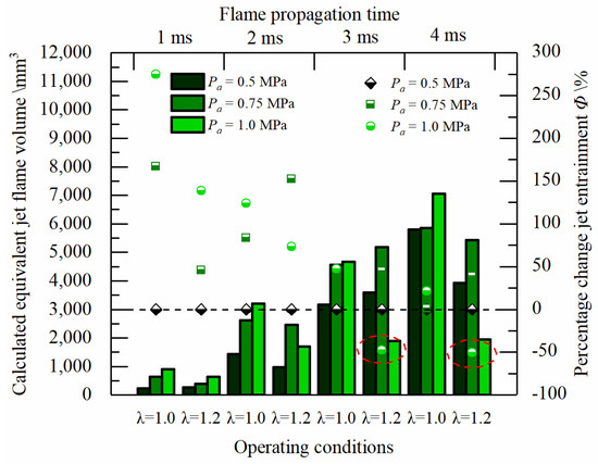 Figure 18 shows the jet volume and entrainment change Φ calculated at different times. At the combustion condition of stoichiometric ratio λ = 1.0, the jet flame volume increases significantly as the ambient pressure increases, and the change rate of entrainment volume at high ambient pressure relative to the low ambient pressure of 0.5 MPa is positive. At lean combustion conditions, the initial jet flame entrainment volume at high ambient pressure increases the jet intensity due to the additional low-flow fuel injection, and the entrainment volume change rate is higher than that at 0.5 MPa low ambient pressure. With the jet flame’s development, the jet flame’s volume at the condition of 1.0 MPa at 3 ms and 4 ms after jet flame ignition in CVCC has been less than that of 0.5 MPa. The change rate of the entrainment amount has become negative simultaneously.