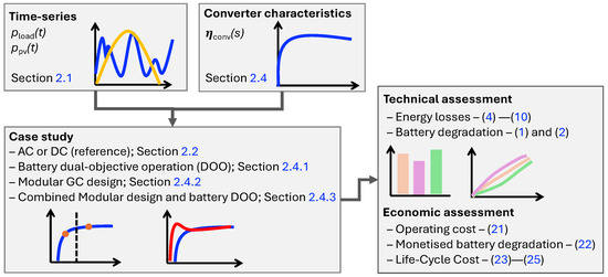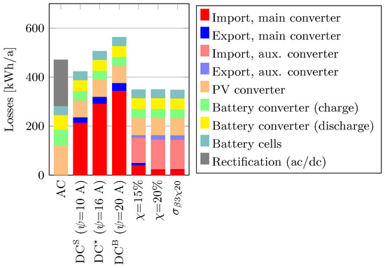Unlike previous findings, this work showed that the sole inclusion of PV and battery storage is insufficient to make DC a superior choice over AC for loss reduction due to the frequent partial converter operation. The results highlighted the importance of converter sizing and its effect on DC performance when using load-dependant efficiency characteristics: 83 kWh/a (−16%/a) for DCS relative to DC∗. However, limiting the GC’s nominal power also restrains the peak power load demand.