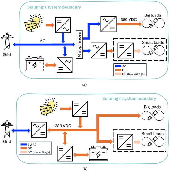 Modelled building’s electric schematic representations for (a) AC and (b) DC distribution. The loss modelling treats the dashed perimeters (DC/DC conversion to low-voltage DC) equally.