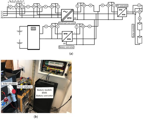 Figure 3a depicts the layout for the efficiency measurements of the DC converters. A Norma D6100A power analyser was used for the battery and PV converter and the AC side of the GC, while the DC side of the GC was measured with a Yokogawa WT1600. Figure 3b shows the measurement installation with the solar emulator, power analyser, battery module, battery management system (BMS), and converter. To capture the complete efficiency characteristics, measurement points were obtained for the full PEC operating range (s∈ 0–100%).