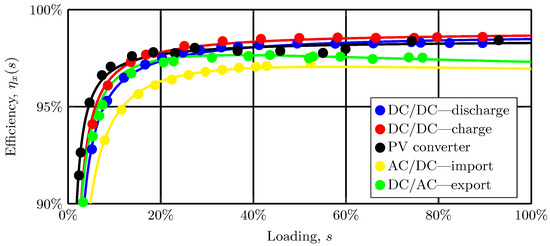 Furthermore, the PECs in previous comparisons on AC and DC building distribution, e.g., [31,32], are typically modelled with constant efficiencies and thus neglect the load dependency, which is paramount for a fair comparison, as highlighted in [16]. Other examples are studies using a range of fixed efficiencies; in [32] the distribution converter, efficiency is modelled in the range 90–95%, and the load-side converter at 85–95%. In [8], the inverter efficiency is set between 85 and 99% and the DC/DC converter between 80 and 90%. As highlighted in [33], the converters strongly influence the system’s performance. Similarly, the battery’s characteristic is often modelled with a constant-round-trip efficiency, e.g., [8,13], which neglects the dynamics in actual operation.