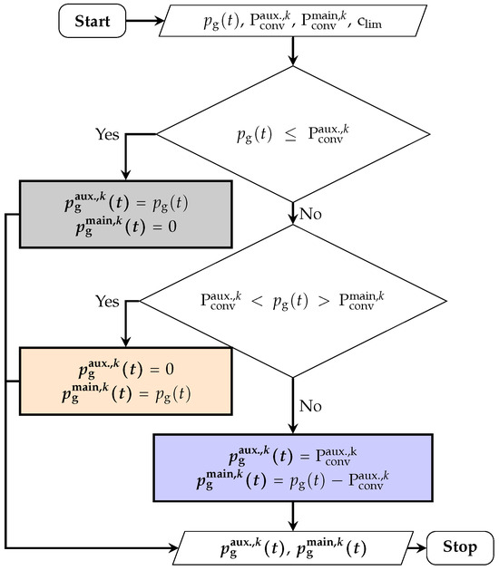 To reduce partial-load operation, a modular GC design is proposed, having two converters operate in a Master/Slave configuration [48] at the tertiary control level [49]. Since this design targets the converters’ load sharing, the battery dispatch remains the same as the reference operation. Figure 6 depicts the proposed load sharing (PLS).