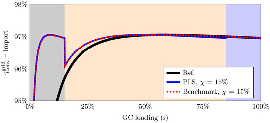 Efficiency characteristics for grid import with the PLS and benchmark (for = 15%), and single-converter operation (Ref.). The colour-coding follows the execution from Figure 6.