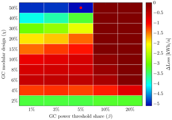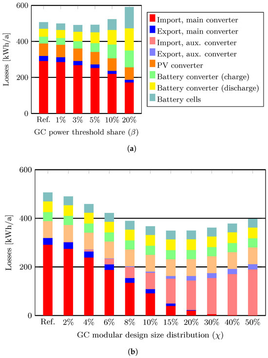 The proposed Master/Slave GC design achieved savings of up to 157 kWh/a (−31% of the annual losses for DC∗) for = 15–20%. Upon combining the modular design and battery, DOO resulted in marginal additional savings: −5.1 kWh/a for relative = 0%, and −1.6 kWh/a for compared with the best-performing case ( = 15%).