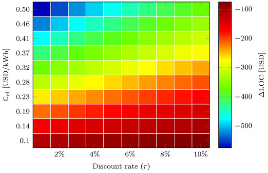 LOC with varying electricity prices, for N = 10 years and r = 5%. in (22) is calculated with = 260 USD/kWh.