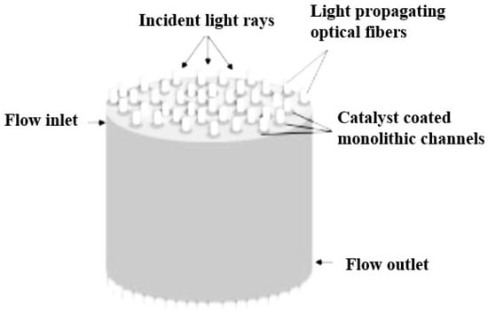 - In a standard continuous photoreactor incorporated with a trough concentrator, the flow of reactants is perpendicular to the incoming irradiation, as illustrated in Figure 25a. Conversely, in the OFMR, both the flow direction and incident rays align parallel to the reaction channels with the internal fibres, illustrated in Figure 25b. The introduction of a monolith into a transparent tube-like concentrated solar photoreactor vertically may cause an increased pressure drop along with the flow direction and the decrement in mass transfer efficiency. Because of these reasons, the requirement of concentrated irradiative flux distribution for OFMR is different. In an OFMR, the orientation of the optical fibres is uniform; by this way, incident rays become more appropriate for the configuration while the compound parabolic concentrators (CPCs) and surface uniform concentrators (SUCs) are structured to give a uniform irradiative flux distribution around the surface of the tubular vessels [157].