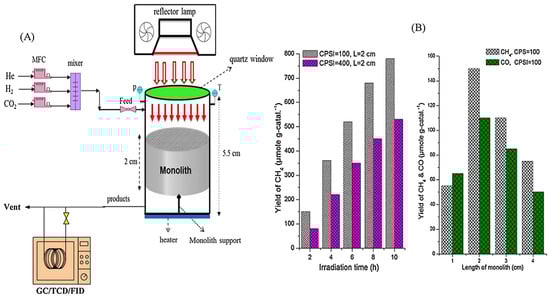 | Monolithic | Fe-MMT/TiO2 | [66] | 200 W Hg lamp | Fed flow rate was 20 mL min−1 at 100 °C | CO 166 μmol g−1 h−1 |