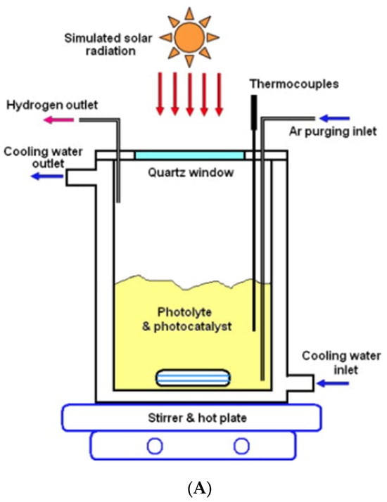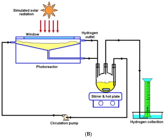 | Modified photoreactor | T = 23 °C, 0.5 g catalyst/300 mL solution; photolyte depth—36.7 mm | H2 = 58 mL/h | Increased H2 production due to the high degree of mixing, avoiding formation of dead zones, particle settlement, and accumulation in the modified photoreactor | [128] | |