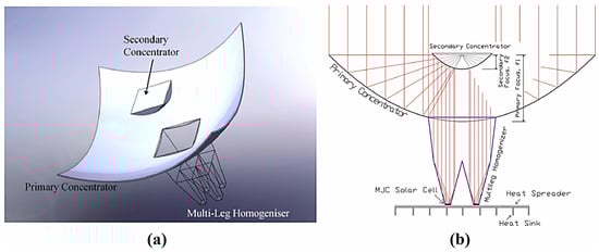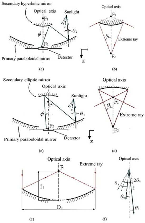 - Chen, C.-F.; Lin, C.-H.; Jan, H.-T.; Yang, Y.-L. Design of a solar concentrator combining paraboloidal and hyperbolic mirrors using ray tracing method. Opt. Commun. 2009, 282, 360–366. [Google Scholar] [CrossRef]