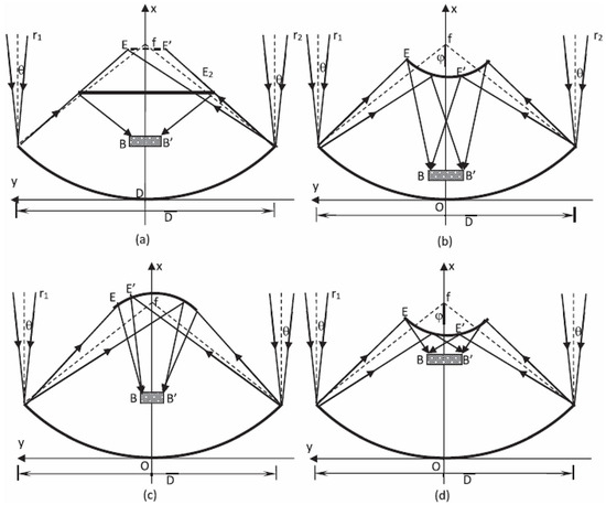 - Meng, X.; Xia, X.; Sun, C.; Dai, G. Optimal design of symmetrical two-stage flat reflected concentrator. Sol. Energy 2013, 93, 334–344. [Google Scholar] [CrossRef]