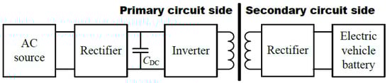 Life safety should be a priority in power transmission devices used in EVs. The circuit architectures to be created should also be developed to ensure this security. In addition, this structure should ensure ease of maintenance. An electrically isolated circuit architecture essentially eliminates the physical conductor and reduces the risk of electric shock. This architecture is shown in its simplest form in Figure 2. According to this structure, the power received from the AC source is transmitted to the rectifier and then converted by the inverter system. The power transmitted from the primary circuit to the secondary circuit via an inductive coupling mechanism is brought to the desired level by the rectifier and transferred to the electric vehicle battery. In industrial environments and residential homes, three-phase AC welding is commonly used for providing high and consistent power output for heavy demanding applications. Three-phase AC welding also provides a more balanced power load, reduced infrastructure costs, high power output delivery for faster charging, and a scalable solution, while also ensuring compatibility with industrial standards. These features make it especially ideal for EV charging and consequently, many EV charging stations charge using a three-phase AC source [6,7].
