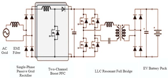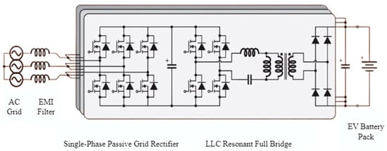 A model of the circuit architecture described above is illustrated in Figure 3. In this configuration, a single-phase AC source is used. The signal is first passed through an EMI filter to reduce electromagnetic interference. The filtered signal is then fed into a two-channel amplifier via a diode-bridge rectifier, which converts the AC signal to DC. This DC signal is subsequently processed by a full bridge LLC (inductor–inductor–capacitor) resonant converter, which conditions the power before transferring it to the battery. This circuit architecture is ideal for low-power charging stations designed for electric scooters, typically providing power levels of around 3.6 kW [8,9,10].
