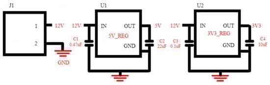 The following circuits are given for embedded system software and communication embedded software. They will be operated at three different voltage levels to power the charge control card and operate other elements: 12 V for the RGB LEDs, fan, and relays, which will be mentioned in the later parts of the report; 5 V for the RB0512 DC/DC converter module; and 3.3 V for processor, GSM module, and Ethernet module. For these voltages, two separate regulators will be used that use the 12 V input value and provide 5 V and 3.3 V output voltages. The created circuit structure is shown in Figure 8 [27,28,29,30].