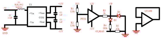 The op amp comparison circuit shown in Figure 9 was created to control these signal voltages. Since the supply voltages of the op amp to be used are +12 V and −12 V, the RB0512 DC/DC converter module, which provides voltage regulation from 5 V to these values, was used. The PWM signal generated by the processor is compared with the CP signal coming from the BMS [26,27,28]. Here, the duty cycle ratio of the PWM signal will determine the charging current. The CP_READ value obtained at the op amp output will be monitored on the processor. Depending on the CP_READ value, the necessary commands for charging will be given (Figure 9).