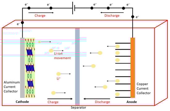 Li-ion batteries are a type of rechargeable battery that undergo redox reactions, enabling them to store electric energy. These batteries comprise four essential components crucial for these chemical reactions: cathode active materials, anode active materials, electrolyte, and a separator. During the charging and discharging processes, lithium ions traverse a porous membrane (separator) and shuttle between the anode and cathode using an electrolyte containing lithium salts. The active materials facilitate the movement of lithium ions via intercalation, a process dictated by their crystalline structure that allows them to fit within designated spaces and either accept or release electrons. During charging, lithium ions deintercalate from the positive electrode and intercalate into the negative electrode, while the current flows through the negative electrode to the positive electrode [36,37]. Conversely, during discharge, lithium ions migrate from the negative electrode to the positive electrode, and electrons move in the same direction through the electrical connection, as illustrated in Figure 11.