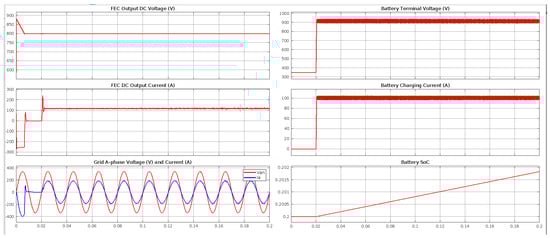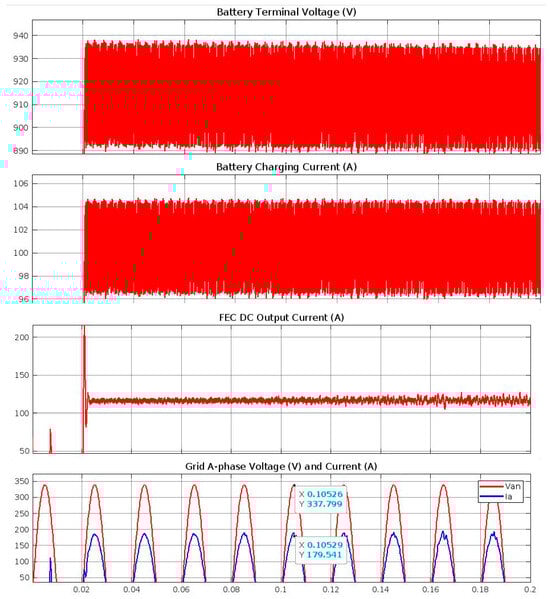 According to the results of the analyses, the DC bus voltage is stable at 800 V, the obtained charging voltage is 917.3786 V, and the obtained charging current is 101.2455 A. Figure 14 illustrates the (up) Battery terminal voltage and Battery charging current, and (below) DC output current and Grid A-phase voltage and current.