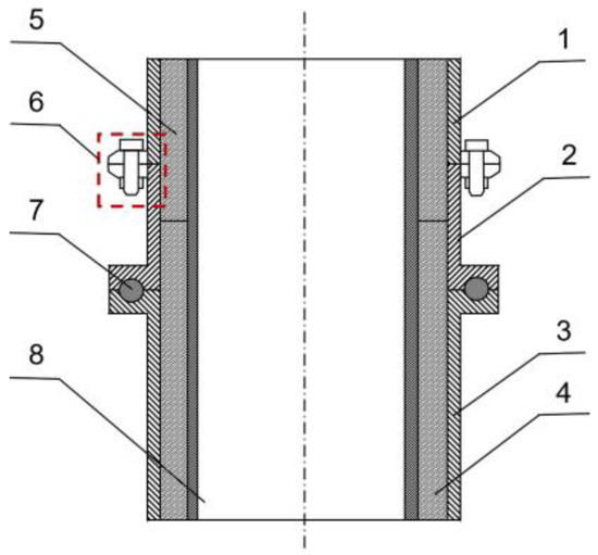 The manner of connection between the rotation and pitch parts of the composite thermal protection structure. Points 1, 2, and 3: skin; 4, 5: aerogel felt; 6: bolt group; 7: stainless steel ball; 8: pan–tilt housing.