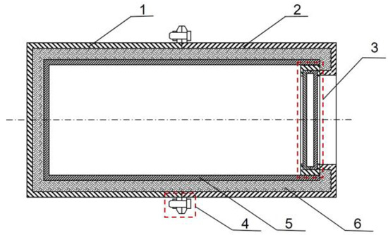 Schematic diagram of the thermal protection for the pan–tilt camera housing. Points 1 and 2: skin; 3: hollow glass; 4: bolt group; 5: pan–tilt camera housing; 6: aerogel felt.