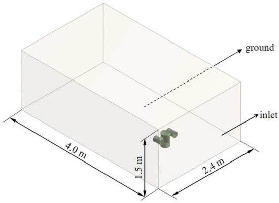 The size of the computational domain in relation to the structure affects the computational process and results. To enhance the calculation accuracy, each boundary surface of the computational domain ought to be as distant from the structure as would be feasible. Nevertheless, an overly large computational domain will result in a greater number of meshes, increased computation, and longer computation time. Therefore, combining the findings of Oliverira [29] and Lakehal [30] and the object and purpose of this paper, the sizes of the computational domain are determined by height of the pan–tilt in this study. The height of the simplified pan–tilt in Section 2 is denoted as HP. The height of the computational domain is 5 HP, and the overall length is greater than 12 HP, while the distance between the inlet of the computational domain and the pan–tilt is 3 HP. The aforementioned dimensioning arrangement avoids reflow at the boundary of the computational domain, thereby facilitating convergence of the computation and concomitantly ensuring the reliability of the results. The height of the simplified pan–tilt HP is 0.3035 m, and the computational domain measures 4.0 m × 2.4 m × 1.5 m, as shown in Figure 6. The bottom surface of the domain represents the ground, and the pan–tilt rests on it. The other boundaries are outlets, except for the inlet. Half of the domain is taken for simulation analysis, due to the symmetrical nature of the model of the pan–tilt and thermal protection structure.