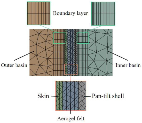 Figure 5 shows the pan–tilt with the composite thermal protection structure, including the details described above. When simulating engineering problems, it is necessary to appropriately simplify the model in order to improve computational efficiency. In this study, the boltholes and baffles in the model have been simplified. The skin is treated as a whole for the purposes of the simulation analysis. The thicknesses of the pan–tilt housing and the skin are each 0.002 m; the hollow glass and the cavity have diameters of 0.118 m and 0.114 m, and thicknesses of 0.01 m and 0.006 m, respectively.