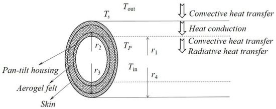 It is becoming a common practice to use robots equipped with various electronic components to cooperate with humans to collect information on accident sites [1,2,3,4,5]. However, in high-temperature environments, the electronic components within robot pan–tilts are prone to functional failure or damage [6]. To ensure that the robot can operate in extremely high temperature conditions, an appropriate thermal protection structure is required.