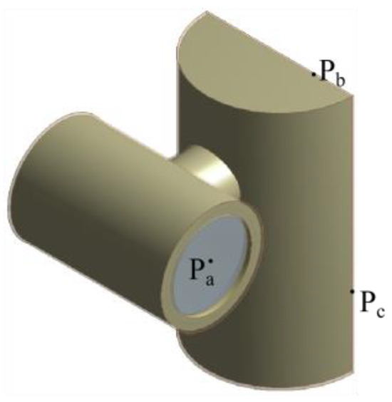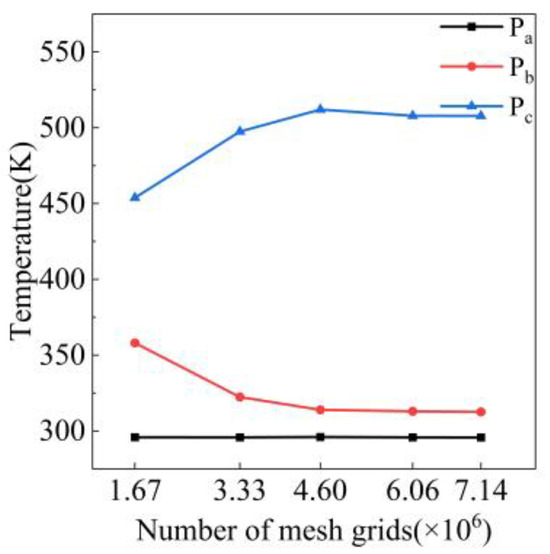 Figure 9 shows the positions of the mesh independence validation points Pa, Pb, and Pc. Figure 10 shows the temperatures of the three points, at 573.15 K under different mesh numbers. It can be observed that the temperatures of the points remain relatively invariant when the number of meshes reaches 4,600,000 or above. Consequently, the number of meshes is set at 4,600,000, with tetrahedral elements being used as the primary mesh type.