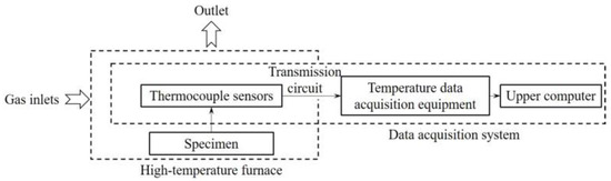 The furnace consists of four gas inlets and one gas outlet, which can be used to regulate the temperature of the experimental environment. The overall size of the specimen is 0.214 m × 0.11 m × 0.11 m; it consists of a thin housing with a thickness of 0.002 m, aerogel felt with a thickness of 0.01 m, a protective skin with a thickness of 0.002 m, and air-filled hollow glass. The glass thickness is 0.016 m and its diameter is 0.082 m, while the internal cavity thickness is 0.004 m and its diameter is 0.07 m. The specimen, with associated thermocouple sensors, is placed inside the furnace. The initial temperatures of both the environment and specimen are 278.15 K. After approximately 20 s, the temperature inside the furnace reaches 573.15 K. The experiment lasts for 30 min, during which the sensor outputs the data from the measurement point to the data acquisition system every minute.