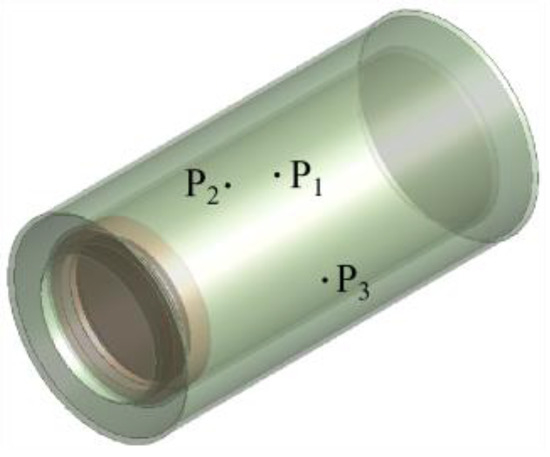Figure 12 shows the computational domain model established based on the aforementioned experiment, the overall size of which is 1.5 m × 1.5 m × 1.5 m. The gas inlets are holes with a diameter of 0.13 m, the centers of which are 0.5 m away from the bottom and adjacent sidewall walls. The gas outlet is a square with a side length of 0.2 m, located at the center of the furnace bottom wall. The positions of the inlets and outlet are shown in Figure 12. The specimen is on the bottom wall of the furnace. Three temperature measurement points, P1, P2, and P3, are selected on the specimen’s inner wall. The positions of these points are shown in Figure 13.