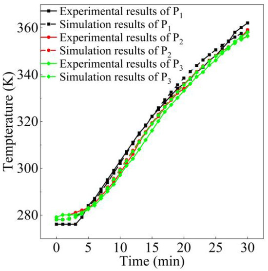 Figure 14 shows a comparison of the experimental and simulation results, under the same working conditions at the temperature measurement points. The maximum temperature differences in the three sets of data are 3.17 K, 2.53 K, and 3.13 K at the different time nodes, while the correlation coefficients are 0.9980, 0.9989, and 0.9983, respectively. The results indicate that the model established in Section 3 can meet the requirements for thermal protection performance simulation and analysis.