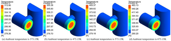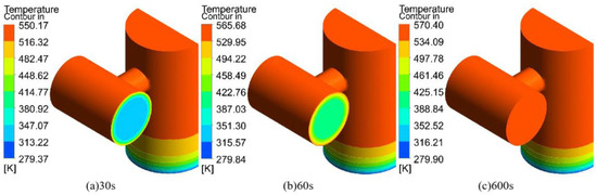 First, an unprotected pan–tilt was simulated and analyzed. The ambient temperature is 573.15 K, and the initial temperature of the pan–tilt and its inner basin is 278.15 K. Figure 15 shows the temperature contour of the unprotected pan–tilt inner basin.