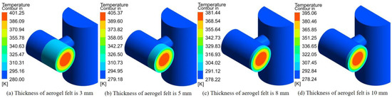 Figure 16 shows the temperature contour of the pan–tilt inner basin with different thicknesses of aerogel felt. The hollow glass used is air-filled. The ambient temperature is 573.15 K. The initial temperature of the structure and the pan–tilt and its inner basin is 278.15 K. By analyzing Figure 17, it can be observed that the temperature distribution of the inner basin remains consistent despite varying thicknesses of aerogel felt. At 600 s, the maximum temperatures of the inner basin are 401.25 K, 405.37 K, 381.44 K, and 395.06 K when the thicknesses of aerogel felt are 3 mm, 5 mm, 8 mm, and 10 mm, respectively. In comparison to Figure 15, it is evident that the temperature of the inner basin is significantly reduced.