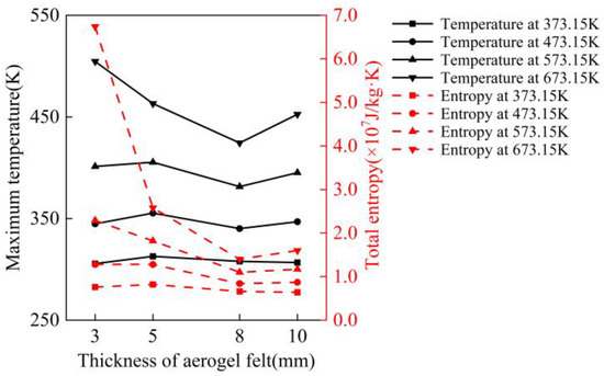 The maximum temperature and the total entropy of the inner basin with different thicknesses of aerogel felt.
