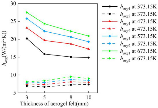 From Figure 18, it can be seen that havg1 decreases with an increase in aerogel felt thickness. When the aerogel felt thickness is 10 mm and the ambient temperature is 673.15 K, havg1 is 20.90 W/(m2·K), which is a reduction of 24.03%, 16.51%, and 5.90% compared to 3 mm, 5 mm, and 8 mm; however, havg2 increases slightly when the aerogel felt thickness is 8 mm, which is 17.84%, 13.21%, and 5.43% higher than with the thicknesses of 3 mm, 5 mm, and 10 mm at 673.15 K. The reason for this phenomenon is that the change in aerogel felt thickness affects the flow state of the high-temperature air on the wall of the structure. In addition, the surface heat transfer coefficients of the structure exhibit a consistent trend across different ambient temperatures.