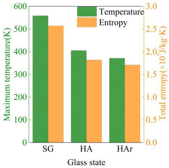 Figure 19 shows the temperature contour of the pan–tilt inner basin with different glass structure types. Figure 20 shows the maximum temperature and the total entropy of the inner basin with different glass structure types. Figure 21 shows the havg of the structure with different glass structure types. The thickness of aerogel felt is 5 mm. The ambient temperature is 573.15 K, while the initial temperature of the structure and the pan–tilt and its inner basin is 278.15 K.