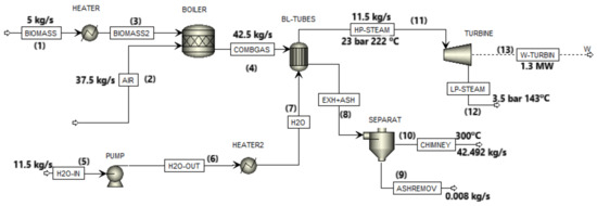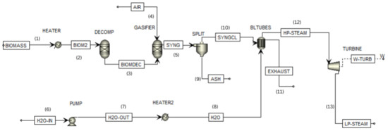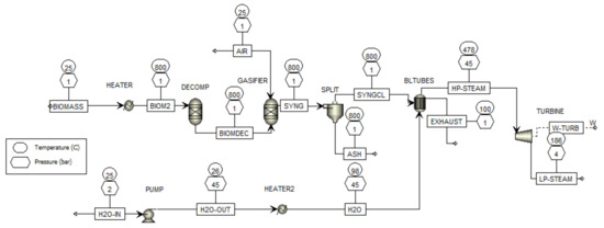 Figure 2 shows the model of the biomass cogeneration plant developed in Aspen Plus. In the original study by Rakaz and Abdulrazik [26], a boiler was employed to simulate the combustion of biomass. However, in the present work, a gasification process is utilized instead.