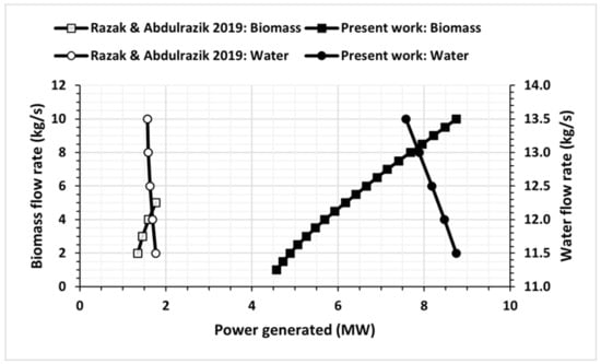 Power generated at different biomass and water flow rates compared with the results obtained by Rakaz and Abdulrazik [26].