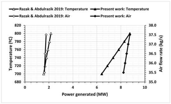 Power generated at different temperatures and air flow rates compared with the results obtained by Rakaz and Abdulrazik [26].